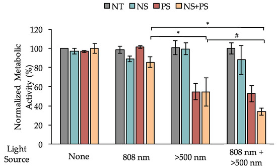 Normalized metabolic activity of MDA-MB-231 TNBC cells following treatment with PEG-NSs and/or the Pd[DMBil1]-PEG750 PSs for 24 h followed by irradiation with 808 nm and/or λexc > 500 nm light sources. # p = 0.06 and * p < 0.05 by 1-way ANOVA with post hoc Tukey.