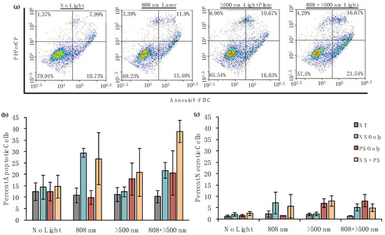 Analysis of the mechanism of cell death using AnnexinV/PI assays following treatment with PEG-NSs and/or Pd[DMBil1]-PEG750 photosensitizers (PSs) and each light source. (a) Representative scatter plots showing the percentage of cells undergoing apoptosis versus necrosis following treatment with Pd[DMBil1]-PEG750 and PEG-NSs with each light source; (b) Percentage of apoptotic cells; and (c) Percentage of necrotic cells following treatment. Data shown are compiled from four independent experiments.