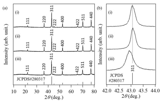 Figure 3a shows the XRD patterns of the different synthesized Co oxide particles having different morphologies. All products exhibited typical spinel Co3O4 crystalline structures (JCPDS no. 280317). The ratio of (220) XRD peak intensity to (400) XRD peak intensity for the raspberry-shaped nanoparticles was 0.963, which is smaller than those of the particles with random morphology (1.10) and cube-like morphology (1.09). Figure 3b shows an enlarged view of the XRD peaks corresponding to the (311) planes of all the synthesized Co3O4 nanoparticles. Compared with the other Co3O4 particles, the (311) peak of the raspberry-shaped nanoparticles was broader.