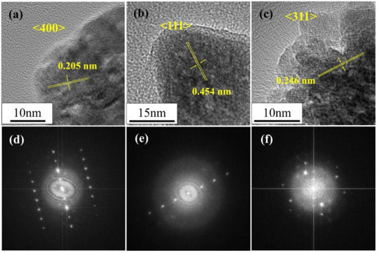 The microstructures of the Co3O4 nanoparticles were further examined via HR-TEM (Figure 4). The lattice fringe spacings of the randomly shaped and cube-like nanoparticles were 0.205 and 0.454 nm, respectively (Figure 4a,b, respectively), which correspond to the (400) and (111) lattice spacings of typical spinel Co3O4 (JCPDS no. 280317). The lattice fringe spacing of the raspberry-shaped nanoparticles was 0.246 nm (Figure 4c), which corresponds to the (311) lattice spacing. In addition, the lattice fringes in the TEM image of the raspberry-like particles seem to be uniform within a single particle, indicating that the nano-raspberries comprised single-crystal-like Co3O4 nanoparticles. The fast Fourier transform (FFT) diffraction patterns of selected areas of the different Co3O4 nanoparticles are presented in Figure 4d–f. The FFT pattern of the raspberry-shaped nanoparticles indicates vertically aligned single-crystal-like Co3O4 nanoparticles, in agreement with the above TEM and XRD results.