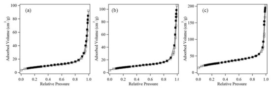 Adsorption isotherms of (a) randomly shaped; (b) cube-shaped; and (c) raspberry-shaped Co3O4 nanoparticles.