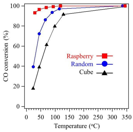CO conversion efficiency measured with decreasing temperature in the range of 25–350 °C for randomly shaped (blue circles), cube-like (black triangles), and raspberry-shaped (red squares) Co3O4 nanoparticles.
