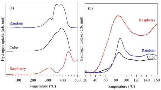 (a) H2-TPR curves of randomly shaped (blue), cube-shaped (black), and raspberry-shaped (red) Co3O4 nanoparticles; (b) Enlarged view of the H2-TPR curves in the temperature range of 20–160 °C.