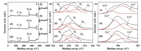 (a) Co 2p, O 1s, and C 1s X-ray photoelectron spectroscopy (XPS) spectra; (b) O 1s spectra, and (c) Co 2p spectra of (i) raspberry-shaped, (ii) randomly shaped, and (iii) cube-like Co3O4 nanoparticles.