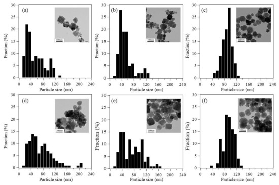 Particle size distributions and TEM images of the (a,d) randomly shaped; (b,e) cube-like; and (c,f) raspberry-shaped Co3O4 nanoparticles before (a,b,c) and after (d,e,f) the CO conversion tests.