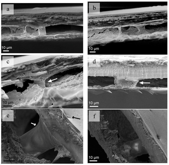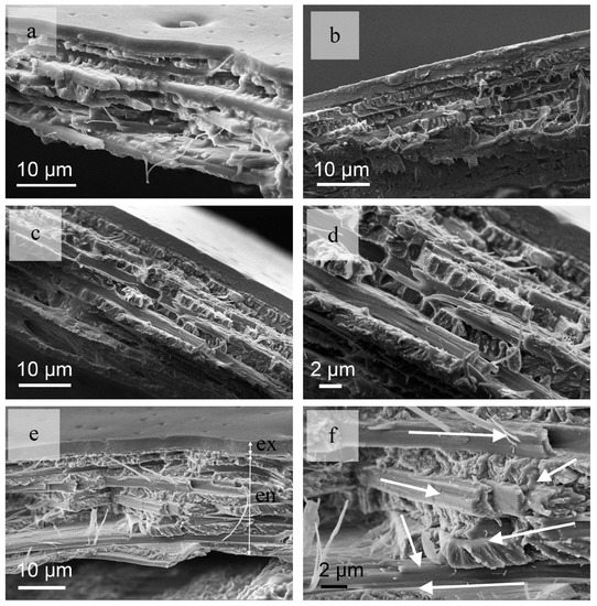 The cross-section view SEM (scanning electron microscopy) images of fiber layers from the C. septempunctata L. elytra. (a–c) show the full fiber layers; (d) shows higher magnification sections of fiber layers; (e) shows the thickness of the exocuticle (ex) and the endocuticle (en) in the C. septempunctata L. elytra; (f) shows higher magnification sections of endocuticle.