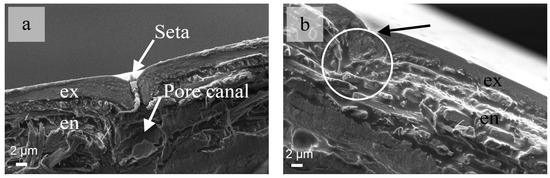Cross-sectional SEM images of the C. septempunctata L. elytra. (a) seta and pole canal in the cuticle and (b) deformation of fiber layers (in white circle).