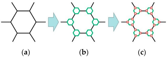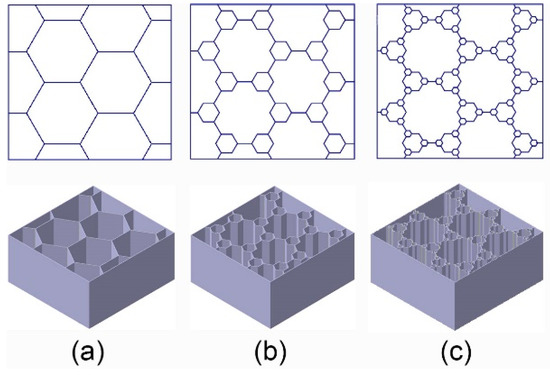 Unit cell of an evolved honeycomb: (a) the original cell; (b) the first order; and (c) the second order.