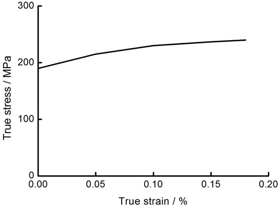 The base material of all numerical examples has been adopted to aluminum alloy AA6063 T6 with the density of 2.7 × 103 kg/m3, the initial yield stress of 162 MPa, a Young’s modulus of 67.9 GPa, the ultimate stress of 191 MPa, and Poisson’s ratio of 0.3 (Table 1) [39]. The models were established with MAT24 in Ls-Dyna (Livermore Software Technology Corp., Livermore, CA, USA). This above material shows strain rate insensitivity, and the true stress-strain value of AA6063 is showed in Figure 7 [40].