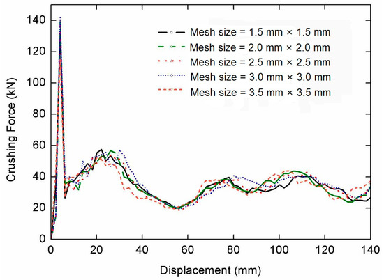 Crushing force versus displacement curves of FE models with five kinds of mesh sizes.