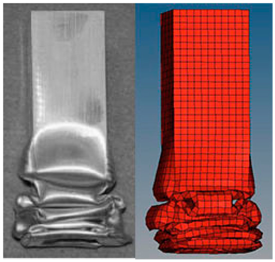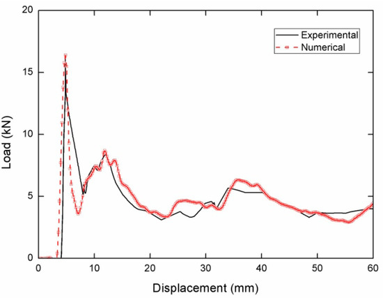 Lee et al. [45] have performed investigation on tubes under low velocity impact. The aluminum AA6063 tubes with 200 mm lengths has been used in their experiment. The impact velocity and weight of cross head were 7.02 m/s and 40 kg, respectively. These values are consisted with the vehicle impact requirements and they are also effectively provide safety for the passenger and drivers [46]. To validate the effect of numerical simulation, the same columns with the equal parameters are produced in this paper. The differences of deformation patterns and crushing curves between the simulations and the experiments are shown in Figure 10 and Figure 11. The crushing mode produced by FE simulations agrees well with the one from the experiments as shown in Figure 10. In addition, the curve of the force versus displacement strongly agrees with the one from the experiments as shown in Figure 11. The above results indicate our FE modelling approach could be used in investigating the characteristic of the BHSs in this study.