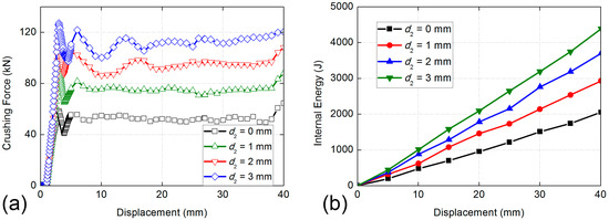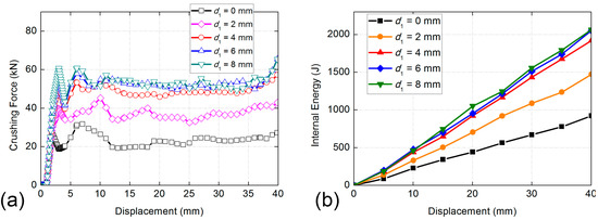 The initial crushing forces of five cases of BHS-1 all obtain a peak value at the same time, then decrease obviously in different degrees, as shown in Figure 12a. Then the curves of all cases show small amplitude oscillations. The maximum value of BHS-1 is the case of d1 = 8 mm, while the mean crushing force of cases of d1 = 6 mm and d1 = 8 mm are very similar. The same trend of absorbed energy of different filling cell size is apparent, as shown in Figure 12b. The BHS without filling cell absorbed the minimum internal energy. With the increase of the filling cell size, the absorbed energy of BHS-1 is increased obviously. Although the internal energy is constantly growing, the trend of growth is slowing gradually. The internal energy of cases of d1 = 6 mm and d2 = 8 mm are both about 2000 J, and the different between them is not obvious. That means the case of d1 = 6 mm and d2 = 8 mm are very similar at the view of energy absorbing ability. Table 2 shows that the SEA of cell size of d1 = 6 mm is 66.79% higher than that of d1 = 0 mm and 15.48% higher than that of cell size of d1 = 2 mm, respectively. Compression force efficiency of cell size of d1 = 6 mm is 7.95% higher than that of cell size of d1 = 0 mm and 4.16% lower than that of cell size of d1 = 4 mm, respectively. In the view of SEA, the cell size of d1 = 6 mm is better than other cell size.