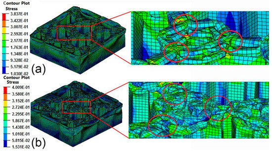 The structural deformations and stress contours of BHS-1 with d1 = 6 mm and BHS-2 with d2 = 2 mm under low velocity loading are shown in Figure 14. The buckling of hollow thin-walled tubes occurs from the top to the bottom along the vertical direction in all numerical simulations. The red circle means the three connections of honeycomb corner in BHS-1, while it is observed that the stress of the connections is higher than that of other structures. In BHS-2, it is difficult to obtain that the stress changes of honeycomb corner. The structure is crushing and the wall of the corner is linked together.