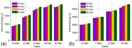 To investigate the impact velocity of the BHS, a parametric study has been carried out by employing the impact velocity from 5 m/s to 20 m/s. Figure 15a,b show the energy absorption versus different velocity of BHS-1 and BHS-2, respectively. Figure 15a shows the energy absorption properties of BHS-1 become better gradually with the increase of the impact velocity. It is obvious that the impact velocity increases 5 m/s, the internal energy will increase by 2%–5%. Similarly to trend of crushing force curve, the energy absorption ability of cases of d1 = 6 mm and d2 = 8 mm are very close. Figure 15b shows the energy absorption ability of BHS-2 increase moderately with the growth of the impact speed. It could be obtained that the impact velocity increases 5 m/s, the internal energy will increase by 0.5%–4%. It can be also observed that the energy absorption property of case of d2 = 3 mm is the best of all cases.