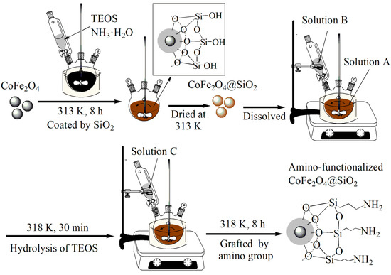 Afterwards, solution C was added dropwise into the above mixed mixture. The above solution continued to react for 8 h. During the process of reaction, Si–OH interacted with –CH3 in APTES to make connected amino groups on the surface of CoFe2O4@SiO2 MNPs. The obtained CoFe2O4@SiO2–NH2 was washed repeatedly with pure water until the solution pH was neutral. Finally, the products were dried and bagged for use.