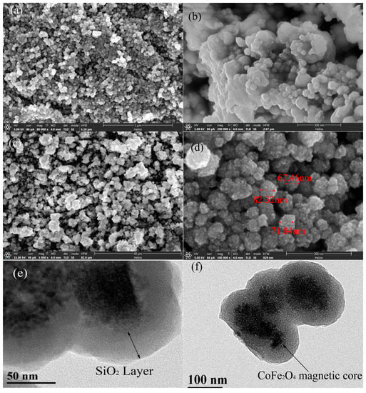 (a) SEM images of CoFe2O4 magnetic nanomaterials (MNPs), Magnification: 80,000×; (b) CoFe2O4@SiO2 MNPs, Magnification: 200,000×; (c) CoFe2O4@SiO2–NH2 MNPs, Magnification: 5000×; (d) and Magnification: 500,000×; (e,f) TEM images of CoFe2O4@SiO2–NH2 MNPs, Magnification: 3,000,000× and Magnification: 1,500,000×, respectively. The three red color texts inserted in Figure 2d represent the size of CoFe2O4@SiO2–NH2 MNPs.