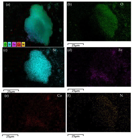 In addition, from Figure 3, it is obvious that there are mainly O and Si elements apart from the Co, Fe, and N throughout the SiO2 shell and CoFe2O4 core, and the Co and Fe elements are uniformly distributed on the surface of the material.