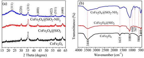 To confirm whether the materials had been synthesized successfully, the XRD method was used. Figure 4a displays the XRD of as-prepared nanoparticles, which reveals a microcrystalline structure in these materials. The characteristics of the CoFe2O4 peaks in the three materials are consistent with the Joint Committee on Powder Diffraction Standards (JCPDS) patterns of CoFe2O4 (22-1086), which indicates that as-prepared materials are determined to be the crystal of CoFe2O4 [25]. In addition, the broad peaks at 23° show an amorphous silica structure in the particles [19], which is consistent with the SEM images shown in Figure 2.