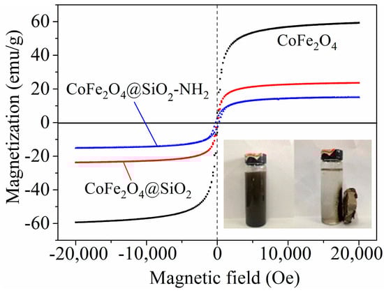 In order to investigate the magnetic performance of various materials, VSM technology was used. Magnetic hysteresis loops of pure CoFe2O4 (black line), the silica coated sample (red line), and the amino modified sample (blue line) are shown in Figure 5. The CoFe2O4 nanoparticles show typical superparamagnetic properties with zero coercive force and residual magnetism [27]. Additionally, the corresponding saturation magnetizations of three materials are 58.9, 23.5 and 15.2 emu/g, respectively.