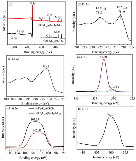 XPS spectra of (a) CoFe2O4@SiO2 and CoFe2O4@SiO2–NH2; (b) Fe 2p; (c) Co 2p; (d) O 1s of CoFe2O4@SiO2–NH2; (e) Si 2p of CoFe2O4@SiO2 and CoFe2O4@SiO2–NH2; and (f) N 1s of CoFe2O4@SiO2–NH2. All of the materials were virgin.