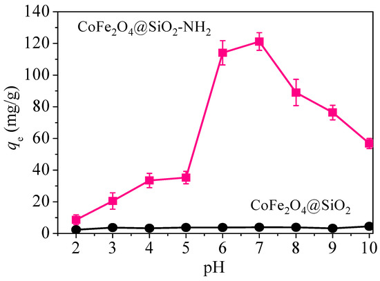The reason for this is that the existence of a large amount of H+ causes the protonation of amino groups on the surface of CoFe2O4@SiO2–NH2 at a low pH, producing a low adsorption rate for Hg(II) [32]. When the solution pH is over 6, the adsorption capacity of CoFe2O4@SiO2–NH2 increases, and a maximum adsorption capacity of 118.7 mg/g is achieved at pH = 7. Afterwards, when the pH continues to rise, the capacity begins to reduce. Therefore, in the following experiments, the condition of pH = 7 was taken as the fixed value of the experiments.
