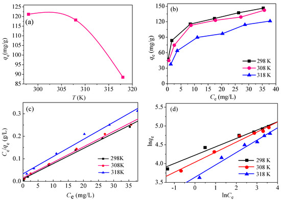 Figure 13a shows the change of adsorption capacity as a function of adsorption temperature. The obtained information shows that the adsorption capacity of CoFe2O4@SiO2–NH2 decreases gradually from 115.5 mg/g to 89.6 mg/g as the temperature increases from 298 K to 308 K, showing an exothermic process. In addition, two different isotherms models were fitted to study the specific influence of temperature on adsorption process.