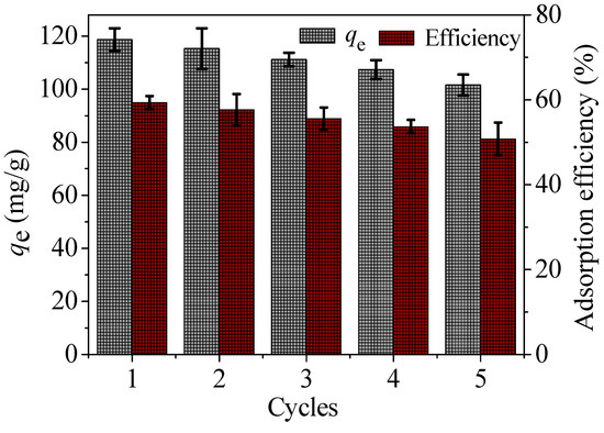As cycle number increases, the adsorption capacities of materials decrease slowly. After five cycles, the adsorption capacity is reduced by 14.4%.