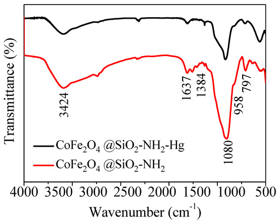 In order to investigate the change of functional groups in the materials before and after adsorption, FTIR was used again. Figure 15 is the infrared spectra of CoFe2O4@SiO2–NH2 before and after adsorption. The weak adsorption peaks at 1350–1600 cm−1 indicate a decrease in the amino groups, which indicates that the amino and Hg(II) ions combine with each other to form a complex, resulting in an almost no amino peak. The above analysis exhibits that there is an interaction between CoFe2O4@SiO2–NH2 and Hg(II). The adsorption mechanism may be that H+ in the amino groups is replaced by Hg(II) to form complex, which is consistent with the analysis of the influence of previous ionic strength.