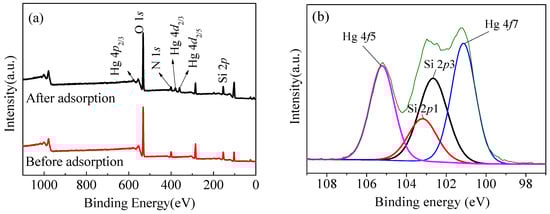 For the purpose of further exploring the adsorption mechanism of Hg(II) onto the materials, the study performed XPS analysis on the samples before and after adsorption. It can be observed in Figure 16a that three new peaks appear at 358.3, 377.8, and 577.2 eV, and the three peaks correspond to Hg 4d5/2, Hg 4d3/2, and Hg 4p3/2, respectively. Meanwhile, the material of CoFe2O4@SiO2–NH2 MNPs has a better stability from the XPS data before and after adsorption shown in Figure 16a. Moreover, as shown in Figure 16b, two new peaks appear at 101.1 eV and 105.2 eV, representing Hg 4f5/2 and Hg 4f7/2, respectively, indicating that mercury is successfully adsorbed onto the material after the adsorption process [43].