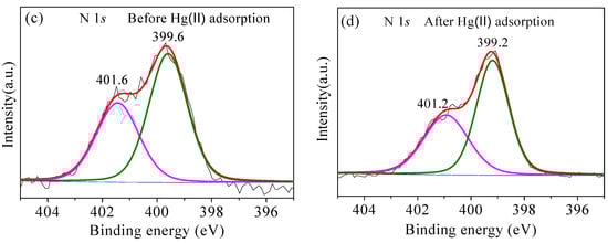 The ratio of protonated amino groups to neutral amino groups decreases from 0.72 before adsorption to 0.64 after adsorption, indicating the complexation of mercury ions with the amino groups [45]. The XPS spectra of N 1s before and after adsorption of mercury are shown in Figure 16c,d, and it can be seen that there are two peaks of −NH3+ (401.6 eV) and −NH2 (399.6 eV), corresponding to the morphology change of −NH2 during the process of adsorption [46,47].
