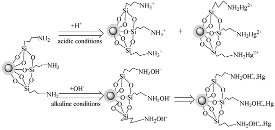 Figure 17 displays the possible mechanism of the adsorption process. Under acidic conditions, the protonated process of amino groups (−NH2 → −NH3+) and the complexation process of the as-prepared materials with Hg(II) occur simultaneously on the surface of amino groups. More −NH2 is converted to NH3+ at a low pH. Namely, most of NH3+ results from the interaction of surface −NH2 and silanol groups [44].