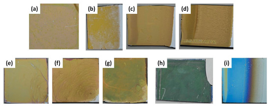 Photographs of MOF optical thin films. (a) OTF-SP, (b) OTF-DP-1, (c) OTF-DP-3, (d) OTF-DP-5, (e) OTF-SA-1, (f) OTF-SA-2, (g) OTF-SA-3, (h) OTF-DG, (i) OTF-LBL.