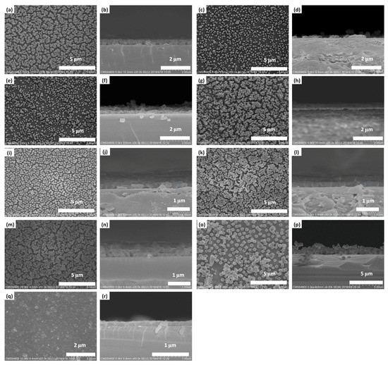 Top-view (a,c,e,g,i,k,m,o,q) and side-view (b,d,f,h,j,l,n,p,r) SEM images of MOF optical thin films. (a,b) OTF-SP, (c,d) OTF-DP-1, (e,f) OTF-DP-3, (g,h) OTF-DP-5, (i,j) OTF-SA-1, (k,l) OTF-SA-2, (m,n) OTF-SA-3, (o,p) OTF-DG, (q,r) OTF-LBL.
