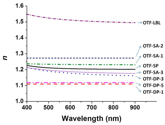 The optical constants of the MOFs-based thin films were explored by spectroscopic ellipsometry. The ellipsometric parameters (Psi, Delta) were obtained in the wavelength range of 400–900 nm at an incident angle of 75°. A Cauchy model was chosen to fit the experimental data. The experimental and generated ellipsometric parameters of the films are presented in Figures S22–S26. The fitting of all MOF thin films present sufficient agreement with the experimental data over the entire measured spectral range, except the film produced by direct growth (Figure S26), suggesting that OTF-DG films cannot meet the requirement of the optical films due to their high roughness. The corresponding thicknesses evaluated via ellipsometry were 379 ± 5 nm (OTF-SP), 285 ± 9 nm (OTF-DP-1), 462 ± 7 nm (OTF-DP-3), 813 ± 4 nm (OTF-DP-5), 273 ± 1 nm (OTF-SA-1), 545 ± 5 nm (OTF-SA-2), 829 ± 6 nm (OTF-SA-3), and 153 ± 2 nm (OTF-LBL), respectively. The variation tendency of the thickness agrees well with the SEM observation. The roughness of the thin films led the ellipsometry method to overestimate their thicknesses because of the high domain on the surface of thin film would be recognized as the surface level. Interestingly, benefiting from the dense and smooth surface of the OTF-LBL film, the thicknesses of OTF-LBL film estimated from SEM observation and ellipsometry method are almost equal. The obtained optical constants for the MOF thin film as a function of wavelength are shown in Figure 3 and Figure S27. In general, the refractive index (n) of the films has this order: OTF-DP < OTF-DP < OTF-SA < OTF-LBL. The n of OTF-LBL has the highest value, which can be considered as the intrinsic refractive index of UiO-66 due to the compactness and integrity of the film. For convenience of discussion, the average index values (from 400 nm to 900 nm) and that at the wavelength of 900 nm (the longest wavelength in the measured range) for all samples are listed in Table 2. The nanocrystal-based films can achieve a refractive index lower than 1.23, which is important for application as antireflection film. Such low refractive index benefits from the cracks and voids between the UiO-66 nanocrystals. Assuming the intrinsic refractive index of UiO-66 was 1.5120, the index of air is 1, the void percent in the film was estimated according to the effective medium theory [13,23,31]. The results are shown in Table 2. We can see that the voids of OTF-SP, OTF-DP, and OTF-SA films are about 25%, 30%, and 23% respectively.