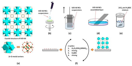 (a) Crystal structure of UiO-66, consisting of Zr-O metal centers connected by terephthalate linkers. Zr, cyan; C, gray; O, red; H, omitted. (b–f) Illustration of five fabrication methods of metal-organic framework (MOF) optical thin film: (b) spin-coating, (c) drop-coating, (d) self-assembly, (e) direct growth, (f) stepwise layer by layer growth method.