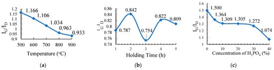 The plot of the IG/ID against (a) carbonization temperature, (b) holding time, and (c) concentration of H3PO4 of the activated carbons.