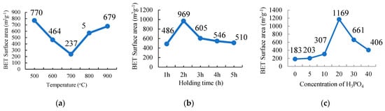 Similar to the carbonization holding time as shown in Figure 2b, a carbonization holding time less or more than 2 h results in a lower BET surface area value. It shows that a 1 h holding time is not enough time to manufacture more pores in the AC and when the samples were treated for more than 2 h, the BET surface area and porosity value reduced with the increasing holding time. The sample was overtreated, which destroyed the pore formation of the AC. The overtreated samples extend the size of the pores from micro- to meso- and macro-pores sizes, which reduced the surface area and porosity of the AC. In other words, the porous structure development does not reach its optimum treatment when the H3PO4 concentration and activation holding time are lower or higher than the values of 20% H3PO4 and a 2 h holding time.