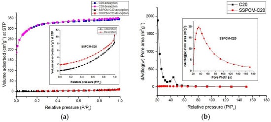 The (a) adsorption-desorption isotherm and (b) pore distribution of the activated carbon (C20) and its Shape-stabilized phase change material (SSPCM-C20). The insets show the expanded y-axis.