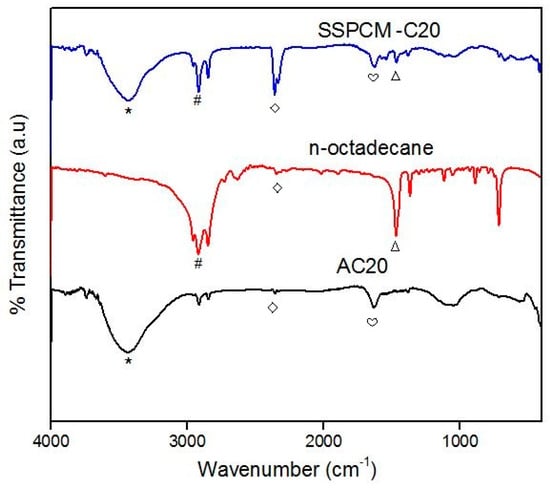 The FTIR spectra of C20, n-octadecane, and SSPCM-C20 (the symbols on the FTIR spectra are assigned to the FTIR adsorption peak; (⋆) 3430 cm−1, (#) 2919 cm−1, (◇) 2360 cm−1, (♡) 1635 cm−1, (Δ) 1470 cm−1.