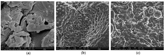 Figure 8 shows the FESEM images of the PKS, C20, and SSPCM-C20 which show different morphologies of the samples. Figure 8a shows the morphology of the PKS, which was used as the precursor for the preparation of activated carbon. The resulting activated carbon prepared from PKS, activated using H3PO4, and carbonized at 500 for 2 h shows a well-developed porous structure with quite a similar shape and size with various pore sizes as shown in Figure 8b. As a result of the encapsulation of n-octadecane into the pores of activated carbon, n-octadecane was absorbed into the porous networks of C20 and completely dispersed and occupied homogeneously into the pores, resulting in the absence of pores.