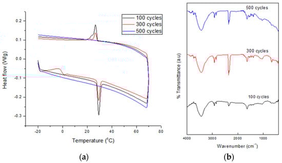 Figure 9 shows the DSC thermograms (a) and FTIR spectra (b) of SSPCM-C20 after 100–500 cycles. The DSC thermograms show peaks of solid-liquid melting and liquid-solid freezing for 100–500 cycles. After 300 cycles, the melting and freezing peaks of the nano-composite were reduced, compared to 100 cycles. No melting and freezing activity for SSPCM-C20 was observed after 500 cycles. The peak keeps reducing until it disappeared at 500 cycles, which indicated that there are changes in the thermal properties of the SSPCM-C20 nano-composite. The FTIR spectra of the SSPCM-C20 nano-composite after 100, 300, and 500 cycles show similar FTIR features, indicating a similar chemical structure and that no chemical reaction between the C-20 and n-octadecane can be clearly observed.