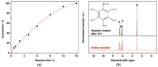 Time on line evolution of products was studied using 1% AuPd/TiO2 (MIm) catalyst at 90 °C, and the result was shown in Figure 1a. After 15 h reaction, the entire NB was converted, and the GC yield of aniline was ca. 99% (GC did not show any other peak). To further confirm the formation and purity of aniline, we compared the 1H-NMR spectra of crude reaction mixture after 15 h of the reaction without any purification, with that of commercial aniline (≥99.5% purity from Sigma Aldrich Company Ltd., Gillingham, UK) as shown in Figure 1b. From this 1H-NMR spectra comparison it is clear that the crude reaction product is as pure as commercial AN standard, hence, the crude reaction mixture can be used for further application without any modification or purification.