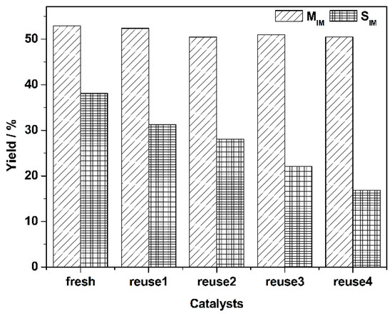 One of the crucial requirements of a heterogeneous catalyst to be used for industrial applications is its stability and reusability. Keeping that in mind, we studied the reusability of 1% AuPd/TiO2 (MIm) and 1% AuPd/TiO2 (SIm) catalysts (Figure 2). For the 1% AuPd/TiO2 (SIm) catalyst, the yield of aniline decreased from 38% to 17% after four cycles. However, for the 1% AuPd/TiO2 (MIm) catalyst, the aniline yield changed only slightly from 53% to 51%, indicating that the MIm catalyst is more stable and reusable than the SIm catalyst. A similar observation was previously reported by our group for the solvent-free selective oxidation of benzyl alcohol to benzaldehyde [35]. During that study, we observed that the PVA, used in the synthesis of 1% AuPd/TiO2 (SIm), blocked the active sites of the catalyst. We believe a similar phenomenon might be present hindering the reusability of the 1% AuPd/TiO2 (SIm) catalyst. On the contrary, the 1% AuPd/TiO2 (MIm) does not contain any stabilizing ligands; hence, this catalyst is more stable and reusable.