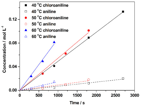 For the kinetic studies, ethanol was used as a solvent to determine the concentrations of substrate and product accurately. For all experiments, the conversion of nitrobenzene was kept to below 20% so that the time dependency of nitrobenzene concentration was linear, and to eliminate the role of products in the rate of the reaction. To ensure that the data was obtained under the kinetically controlled region, we performed the reactions at different agitation speeds, and selected an appropriate parameter (result not presented) to eliminate the effect of the mass transfer. The initial rate of the reaction was calculated at 40, 50, and 60 °C and the results are presented in Figure S1. The apparent activation energy (Ea) was calculated to be 37 kJ mol−1 from the dependence of ln(k) on 1/T with R2 > 0.99 (Figure S1). This value was similar to the values reported recently (37 kJ mol−1 over Pt/γ-Al2O3 by Peureux et al. [36], and 28 ± 5, 33 ± 5 and 45 ± 5 kJ mol−1 over Ru/FeOx by Easterday et al. [15], and 35 ± 1 kJ mol−1 over Pd/C by Turáková et al. [7]) for this reaction. This activation energy value also gives evidence that the reaction was carried out under a kinetic regime, otherwise the value should be in the range of 5–15 kJ mol−1 if the diffusion played an important role [7].