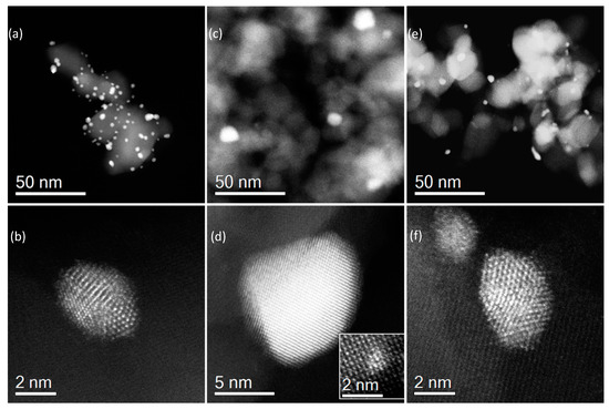 Figure 4 shows representative high angle annular dark field scanning transmission electron microscope (HAADF-STEM) images of 1% AuPd/TiO2 catalysts prepared by (a, b) SIm, (c, d) CIm, and (e, f) MIm, respectively. From the lower magnification images in Figure 4a,c,e, the CIm resulted in particles of 10–20 nm in size, while both the SIm and MIm produced particles largely within the 2–5 nm range. From the higher-magnification HAADF images of individual particles, it can be seen that 10–20 nm particles produced by CIm showed clear signs of a Pd-rich shell structure (Figure 4d). The particles produced by SIm (Figure 4b) and MIm (Figure 4f) appeared to be random alloys without a distinctive core-shell morphology. Some 1 nm or sub-nm clusters could also be occasionally found in the catalyst that was prepared by the CIm method (inlet of Figure 4d). These were Pd-rich clusters that were probably strongly bonded to the oxide support and therefore did not merge to form bigger particles.