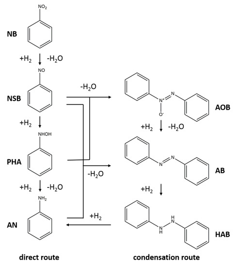 Aniline (AN) is an industrially very important intermediate for the production of dyes, agricultural chemicals, pharmaceuticals, polymers, etc. [1,2,3]. About 85% of aniline is produced via the catalytic hydrogenation of nitrobenzene (NB) using gaseous H2 under either liquid or gas phase conditions, as it is environmentally benign, and water is the only by-product in this reaction [4]. Moreover nitration of aromatic compounds is a very well established and optimized technology, which makes nitroarenes a readily available feedstock for the production of bulk and/or fine chemicals [5,6]. The Haber reaction mechanism, as shown in Scheme 1, was the generally accepted reaction mechanism for the nitrobenzene hydrogenation for a long time [7]. Aniline can be formed via two routes. In the direct route, NB is reduced to nitrosobenzene (NSB), then to N-phenylhydroxylamine (PHA), and finally, to form AN. The condensation route involves the formation of azoxybenzene (AOB) from the condensation of NSB and PHA. AOB is then reduced to azobenzene (AB) and hydrazobenzene (HAB) as intermediates. HAB is finally hydrogenated to AN. In this route, condensation of NSB and AN to form AB may occur as well.