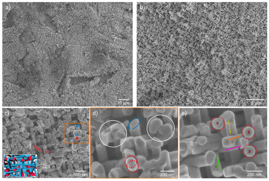 After dissolution of the polymer, morphology and mechanical integrity of the nanowire networks were analyzed by high-resolution SEM (HRSEM). Figure 3 shows the SEM images of a representative network with 150 nm diameter wires along 5 directions (number density of wires ~5 × 109 cm−2). The homogeneous growth of the network over the whole sample is visualized in Figure 3a over a ~100 × 120 µm area. Figure 3b,c show zoomed-in SEM images. In the inset, tilted and vertical wires are marked in blue and red, respectively. A higher magnification SEM image of the area marked in orange is shown in Figure 3d, which displays junctions between multiple wires. Regions marked in white illustrate that several wires interconnect at the same position. The advantage of this network structure is that the overlap of wires is mainly limited to junctions, keeping the one-dimensionality of the structure. Figure 3e shows the five different orientations. The total density of the resulting ZnO material can be adjusted by varying the nanowire density and/or the diameter. SEM images of nanowire networks with the same density of wires, namely 4 × 5 × 108 cm−2, and wire diameters of 210, 150, and 90 nm are shown in the Supplementary Information (Figure S2).