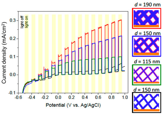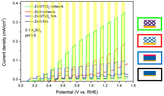 Figure 9 shows the LSVs recorded for the networks of ZnO nanowires with diameters of 115, 150, and 190 nm, all ALD coated with a 4 nm-thick TiO2 layer. The density of the nanowires was 5 × 5 × 108 ions/cm2, the nanowires being assembled from 5 directions (see Supplementary Information, Figure S2). ZnO was electrodeposited in all membranes under the same conditions, using the same electrolyte and applying U = −1 V vs. Ag/AgCl at 60 °C. After dissolution of the polymer membrane, the nanowires were coated with 4 nm TiO2. A network with 150 nm-wide wires remained uncoated. The LSVs were recorded under chopped illumination conditions with a scan rate of 10 mV/s using a 0.1 M K2SO4 (pH = 5.6) solution.