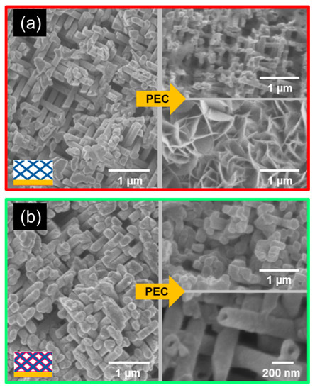 SEM images of (a) ZnO nanowire network and (b) ZnO/TiO2 nanowire network taken before (left) and after (right) PEC measurements. The insets schematically display the cross-section of each sample, indicating the distribution of the various materials—namely, gold (yellow), ZnO (blue), and TiO2 (pink).