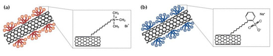 Before the preparation of CNT dispersion, 1 g of each surfactant, such as SDBS and CTAB, was ultra-sonicated with 100 mL of H2O for 5 min. Then, 0.1 g of SWNT was added with this solution under ultrasonic agitation for 3 h at room temperature with the aim of making a good dispersion. Finally, the dispersed SWNT solution was centrifuged for 30 min to collect the supernatants. The chemical interaction between CNT and surfactants (SDBS and CTAB) is illustrated in Figure 1.